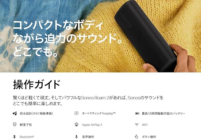 Roamの最新モデル。Wi-Fi、Bluetoothが利用可能。防滴、耐衝撃設計。1回の充電で最長10時間連続再生。2台でステレオペアも可能。
