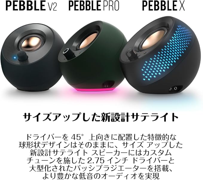 Pebble Xのサテライト スピーカーは、従来の2.0chタイプのPebble シリーズよりも大型化されたパッシブ ラジエーターを搭載しており、より豊かな低音を実現