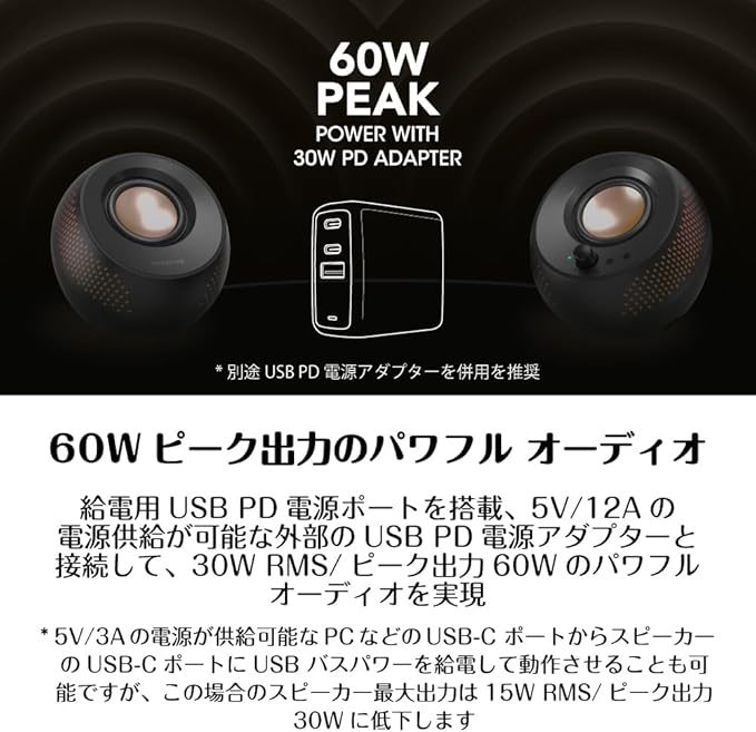 サブウーファーの無いシンプル2ch設計でもUSB PD電源アダプターから電源を供給することで、30W RMS/ピーク出力60Wのパワフル オーディオを実現