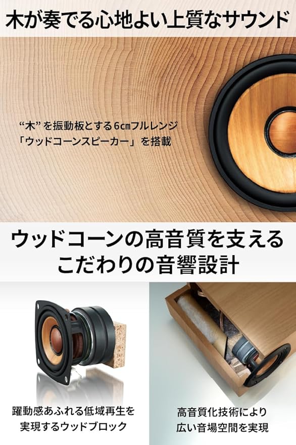 【木が奏でる美しい響き】“スピーカーは楽器でありたい”という想いから生まれた、“木”を振動板とする6cmフルレンジ「ウッドコーンスピーカー」を搭載。自然で美しい響きと豊かな音楽空間を楽しむことができます。原音を忠実に再現させるため、振動板にはカバ材、センターキャップにはチェリー材を採用し、音の明瞭度を向上。艶やかでクリアな中高域再生を実現することで小口径ながら定位感の良さとキレのある表現力、広い空間表現を実現しました。