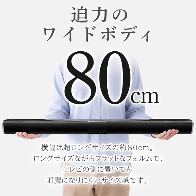 サウンドバーならではの迫力のワイドボディ横幅は超ロングサイズの約80cm。ロングサイズながらフラットなフォルムで、 テレビの側に置いても邪魔になりにくいサイズ感です。20wパワフルサウンド。52mmフルレンジスピーカーユニット10w 2基+90mmパッシブラジエーター 2基搭載