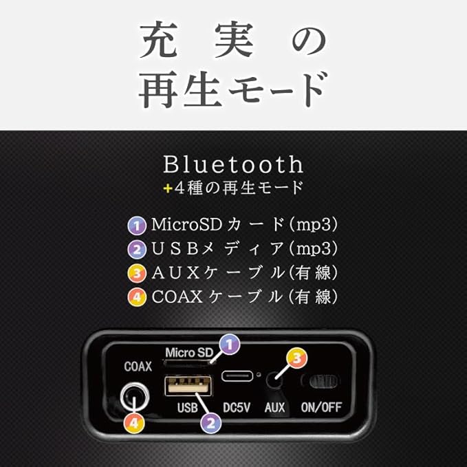 充実の再生モード。Bluetooth+4種の再生モード。MicroSD カード (mp3)、USBメディア (mp3)、AUXケーブル (有線)、COAX ケーブル (有線)。Bluetooth は最新のVer.5.4 を採用。スムーズかつ安定した通信で、スマートフォンや テレビの音源をワイヤレスで再生します。mp3 モード。mp3形式の音楽ファイルの再生にも対応。使用メディアは、 microSDカードとUSBメモリー の2種類を採用。