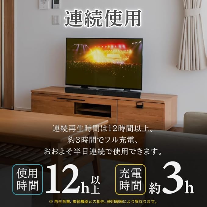 このサウンドバーは、有線接続は2種類から選択可能。一般的な AUX モードに加えてより良質な音声 音楽が再生可 能な COAX モード※2 を採用。連続使用時間は12時間以上。 約3時間でフル充電、おおよそ半日連続で使用できます。設置方法は、置くだけの床置きと背面のフック穴を使用した壁掛け設置が可能。