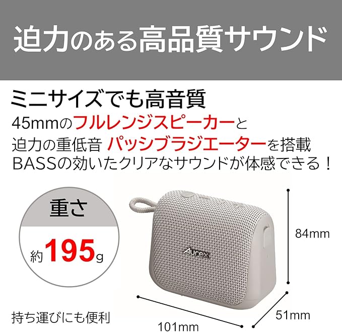 【360 動画あり】AUREX ワイヤレススピーカー TY-WSP50 Bluetooth IP67 防塵 防水 仕様 ハンズフリー通話 対応 コンパクト 最大11時間 使用可能 Type-C 充電 TWS対応 ライトグレー