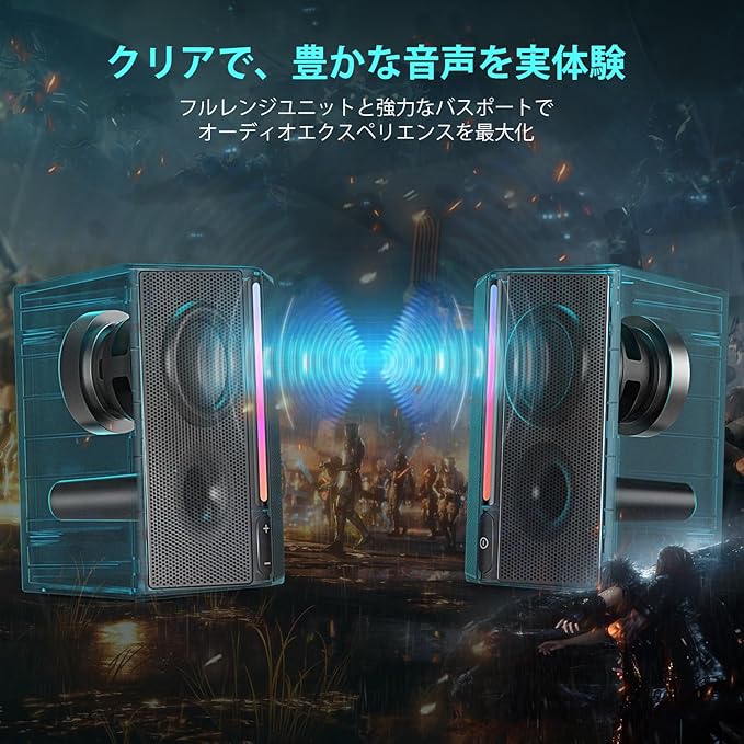 【色鮮やかなRGBライト】ステレオスピーカーには、合計13種類のRGBライトモードが備わっており、かつタッチ式のRGBライトコントロールで自由自在に変換でき、テーブルショーを個性化を実現し、ゲームや音楽鑑賞にもより一層楽しめます。