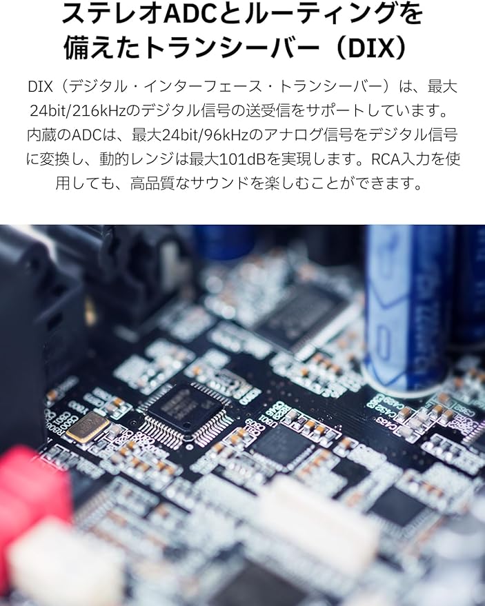 【ステレオADCとルーティング機能を備えた】 デジタル・オーディオ・インターフェース・トランシーバー(DIX)は最大24bit/216kHzのデジタル信号の送受信をサポート。統合型ADCはアナログ信号を24bit/96kHzのデジタル信号に変換可能で、最大100dBのダイナミックレンジを達成。RCA入力接続時も高音質なサウンド再生を実現します。