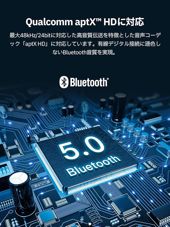 【aptX HDに対応】 最大48kHz/24bitに対応した高音質伝送を特徴とした音声コーデック「aptX HD」に対応しています。有線デジタル接続に遜色しないBluetooth音質を実現。