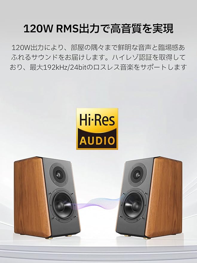 【合計120W出力 ハイレゾ認証済】120W出力により、鮮明なボーカルと没入感あふれるサウンドをお部屋の隅々まで再生。ハイレゾ認証を取得し、24bit/192kHzのロスレス音源に対応。45Hz~40kHzの広域周波数特性により、音楽の微細なディテールまで忠実に再現します。