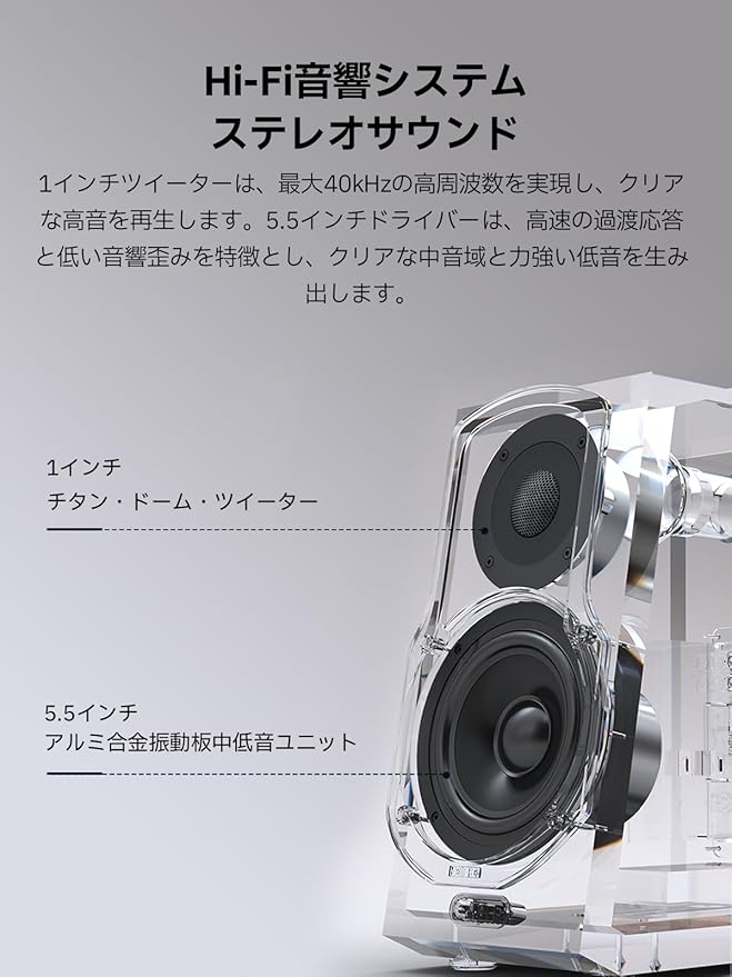 【Hi-Fi音響システム ステレオサウンド】1 inch チタン製ダイアフラム・ドームツイーターが40kHzまでの高周波を再生し、鮮明な高音を再現。5.5 inch アルミ合金振動板中低音ユニットは、高速過渡応答と低歪み特性を兼ね備え、クリアな中音域とパワフルな低音を再現します。