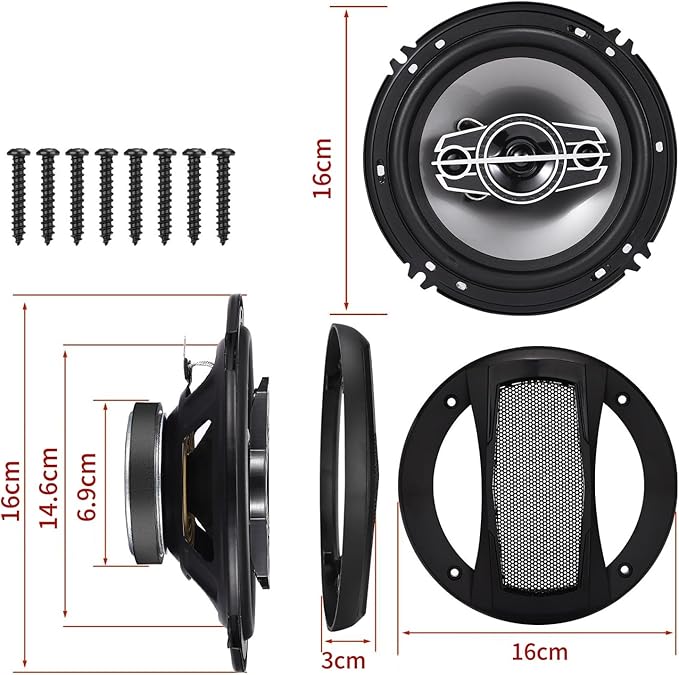 【パッケージとサイズ】サイズ:直径(約16cm)、カースピーカー 2、スピーカーカバー 2、スピーカー接続線 2、取り付けネジ 8