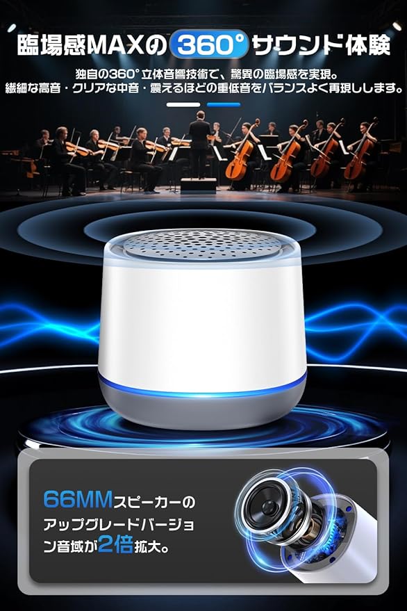 【360 サウンド・豊かな音質】このワイヤレススピーカーは52mmフルレンジスピーカーユニットを内蔵し、360 全方位に高音質なサウンドを拡散できます。深みのある低音とクリアな中高音をバランスよく再現し、まるでライブ会場のような臨場感を味わえます。また、広い互換性を備えており、iOS/Androidスマホやタブレット、PC、Bluetooth対応テレビなど、さまざまなデバイスと簡単に接続可能。リビングや寝室でも、どこでもコンサート気分を楽しめます。