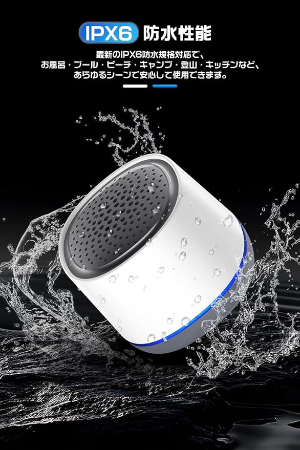 【コンパクト設計・IPX6防水】手のひらサイズ(75 61 72mm)の丸型デザインで、インテリアとしてもおしゃれな存在です。IPX6防水仕様を備えたお風呂スピーカーとして、浴室での使用に最適です。キッチンやアウトドアなど、日常のさまざまなシーンでも安心してお使いいただけます。防水キャップを備えた完全密閉構造の防水スピーカーなので、水しぶきやほこりの侵入を徹底ブロックできます。コンパクトでありながら頑丈な設計で、どこへでも手軽にお持ちいただけます。