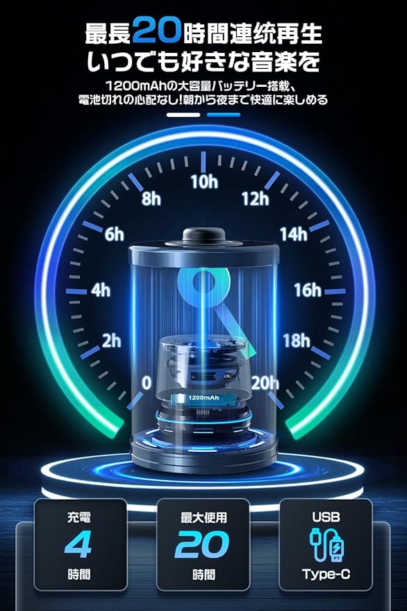 【長時間駆動・Type-C充電】本ぶるーとぅーすすぴーかーはType-Cポートを採用し、従来のMicro USBより高速充電が可能です。1200mAhの大容量バッテリーで、最大20時間の連続再生を実現しました。充電中の音楽再生も可能なため、切れそうな時でもすぐに対応できます。外出先や旅行先でも充電切れの心配が少なく、一日中音楽や動画をお楽しみいただけます。