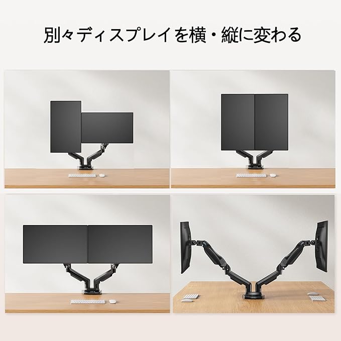【ディスプレイ角度を自由に変えれる】①アーム:ガス圧で高さ調節 ②アーム関節部360 ③VESAプレート部:上向き85 、下向き30 、回転360 、左右各90 。角度や距離などが自分に合って、前後左右に加えて上下も好みの位置に軽々と動かすことができます。ビジネスでの利用はもちろん、トレーダーやゲーマーの方にもおすすめです。