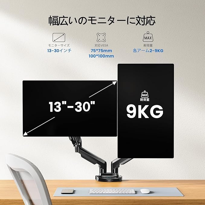 【ご購入前のチェックポイント】①モニターのサイズは13~32インチまで ②モニターとモニターアクセサリーの重量は2~9㎏以内 ③75mm*75mmと100mm*100mmのVESA規格に対応 ④取付可能天板:厚さ15mm~90mm。