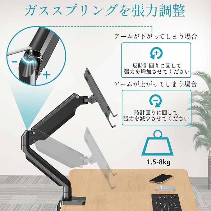 【ガススプリング内蔵】ガス圧式アームにより、軽い力でノートパソコンを上下左右および前後に移動でき、ネジの緩めや締めといった手間は必要ありません。