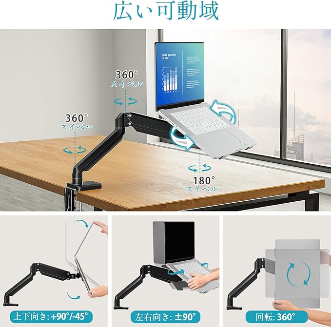 【多角度調整】チルト(上下傾き):上45 /下45 。パン(首振り):左90 /右90 。ピボット機能:回転360 。アームは上下左右だけなく、前後にも動作し、画面との距離が調整可能です。目線の高さに合わせて上下調節も行えます。