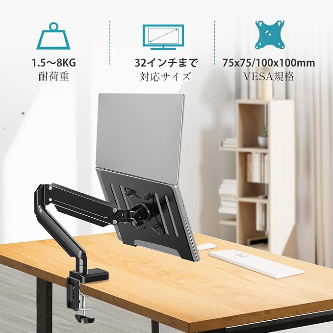 【対応ノートパソコン】ノートPCを1台設置できるノートパソコン用アームです。トレイを外したら、モニターアームとしても利用可能。耐荷重は1.5~8kgまで、13~32インチのモニターに対応可能。準拠のVESA規格は75mm/100mm。