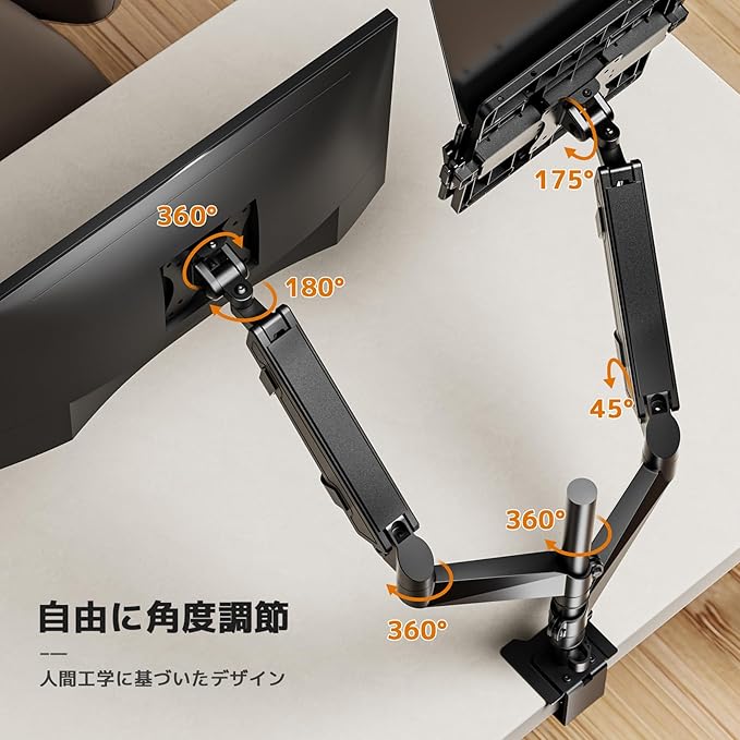 【2画面・トレイ付き】二画面のガススプリング式アームで自由自在にモニターやパソコンを配置できて、机がスッキリ片付きます。各アームは最大32インチのモニターに対応可能、耐荷重は0-9kgとなります。また、ノートパソコントレイが付いており、12.5-16.5インチのデバイスに対応可能。ゴムパッドが2つ設置され、溝に挿し込んでパソコンが擦り傷から保護され、放熱性も優れます。トレイはクランプが付き、載せたパソコンの両端を挟み、チルトの変更によって滑り落ちることを抑えます。★アームの可動域を確保するために、デスク環境を予め確認する必要があります。