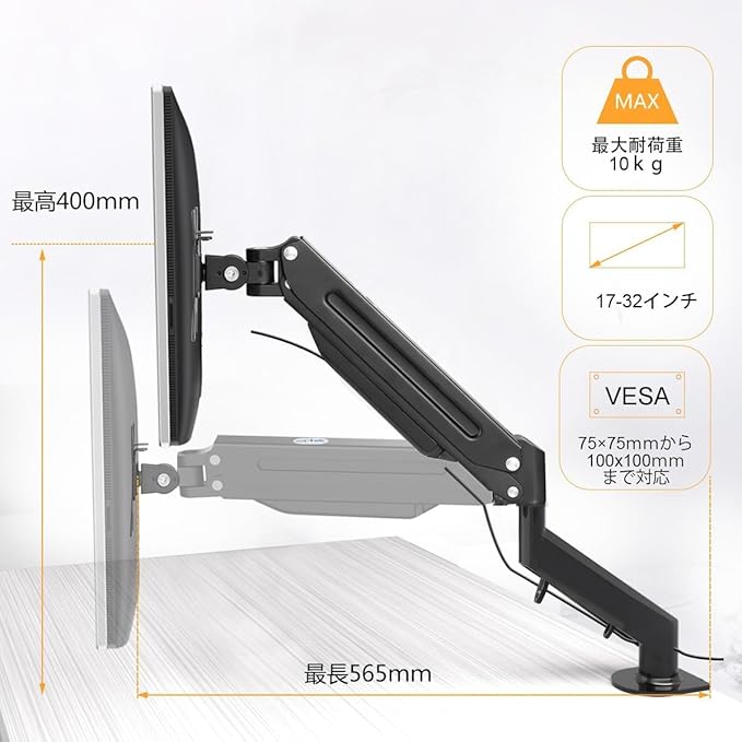 【商品仕様】15インチから32インチまでの液晶ディスプレイに対応できるモニターアームです。対応規格:VESAマウントインターフェース規格(FPMPMI)75mm/100mm 、耐荷重は1-10KGです。