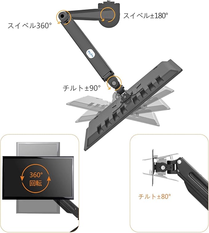 【角度調節】革新的な多軸設計で画面を上80 、下80 、左右180 、回転360 に調節可能で、活動範囲が広くて便利です。どんな姿勢でも液晶画面が見れて、目の疲れを軽減でき、作業効率が上がります。
