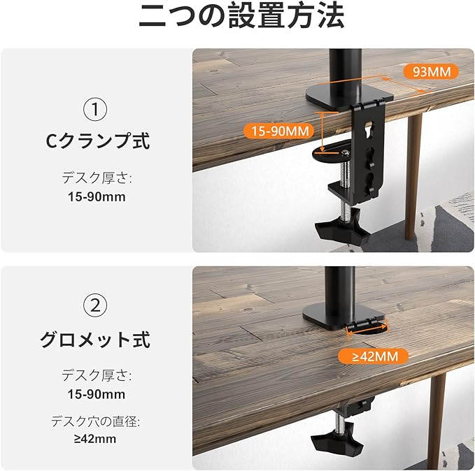 【省スペース】モニターの台座を必要としないので、モニタ下のスペースに書類やキーボードなどを収納でき、デスクの上を広く使うことができます。アーム内部にケーブルを収納できるケーブルホルダーが付いているのでケーブルをキレイに配線できます。ケーブルが遊ばず邪魔になりません。