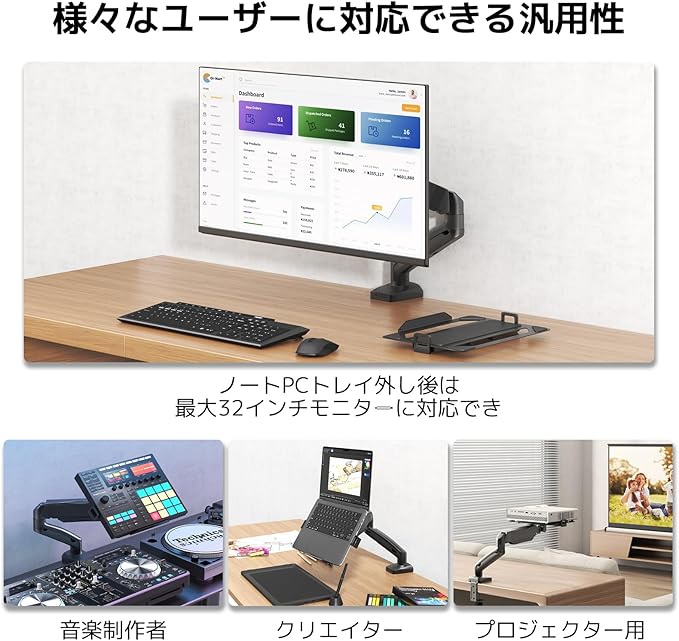 安定性抜群のトレイ設計: 側面ロックフックと底面ストッパーでノートPCを固定 耐滑性EVAパッドと通気性穴付き トレイ外すと15-32インチモニター用アームに変換可能