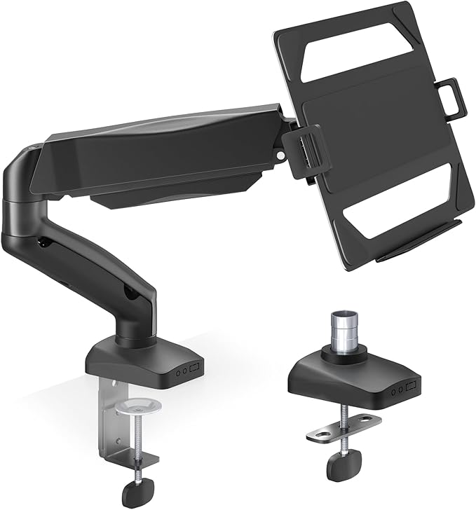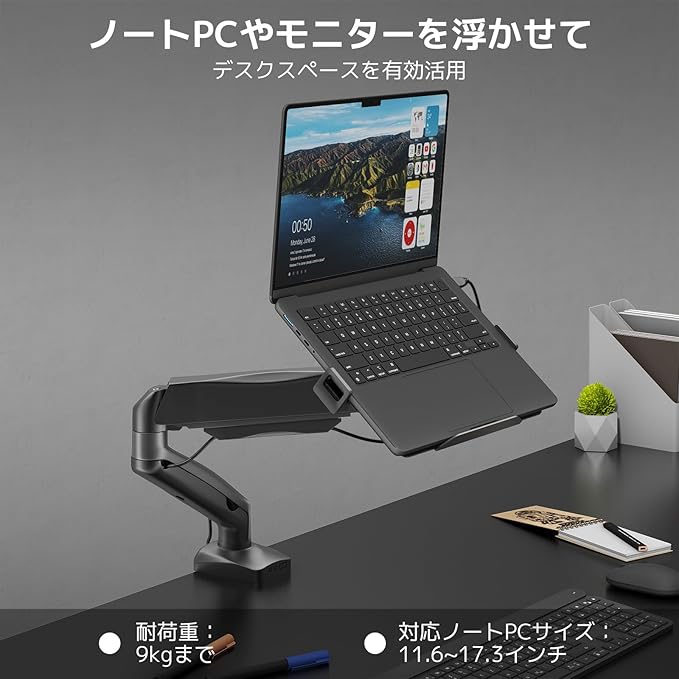 ACCURTEK ノートパソコン対応 トレイ付きモニターアーム ノートPC17インチまで/モニター15-32インチ対応 ガススプリング式 グロメット&クランプ両用 VESA75/100 耐荷重9kg ケーブル管理 上下左右多角度調節 デスク省スペース (品番AC13-12NB)