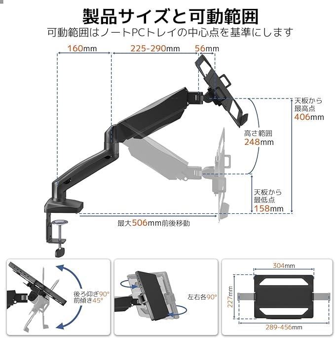 プロ級調整機能: ガススプリング式アームで重量微調整 上下24.8cm/前後50.6cm/360度回転 チルト後仰ぎ90度+前傾き45度・左右各90度調節