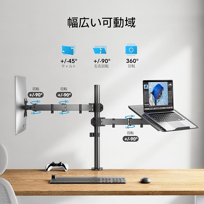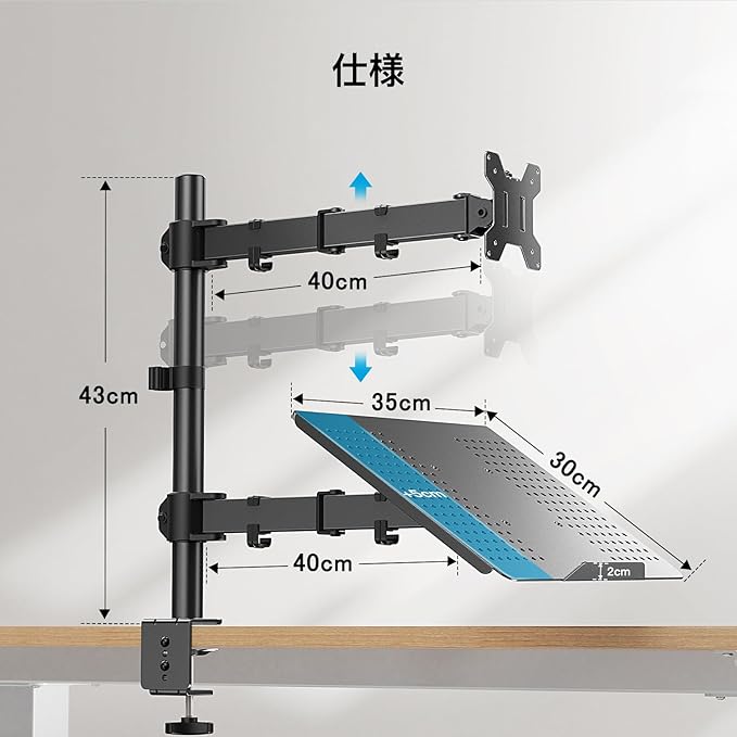 【2in1モニターアーム】PCモニターアームとノートパソコンスタンドが融合されていて、ディスプレイやノートパソコンがより快適に使えます。PCモニターとノートパソコンという組み合わせになってますが、2枚PCモニターをつけることも可能です。PC&ノートパソコンのデュアル環境の方にお勧めです。