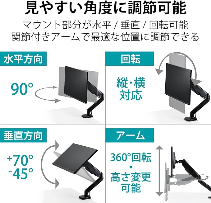 アーム部分が360度回転するので、オフィスや自宅でのレイアウト調整が簡単に行えます。