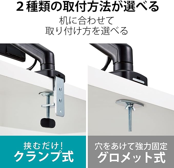 グロメット式とクランプ式の両対応なので取り付ける机に合わせて選べます。