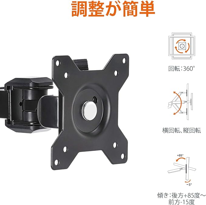 360度回転(横置きまたは縦置きに対応)、20cmから36cmまで高さ調節可能な水平の取り付けアーム