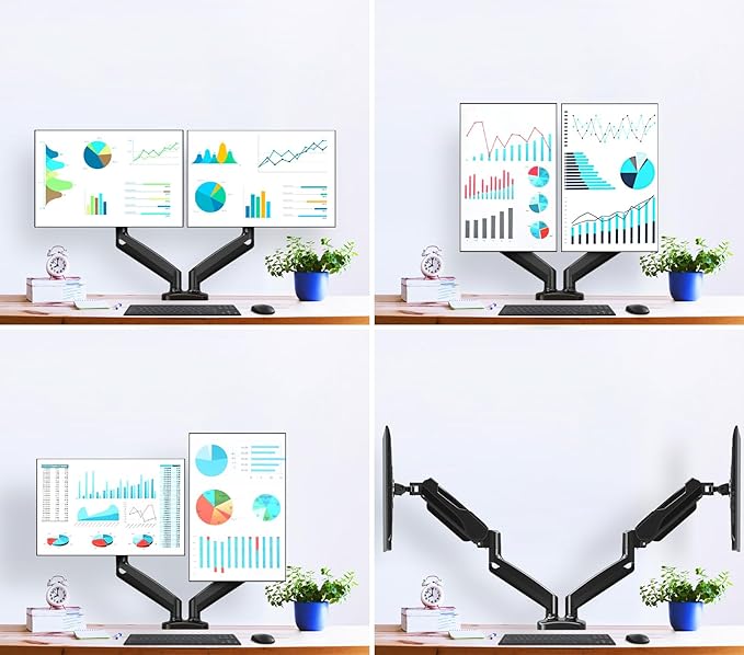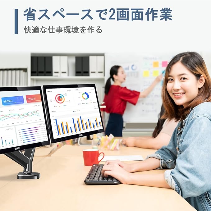 【デュアルPC作業】2画面設置でき、1つは縦方向、もう1つは横方向など、変則的なデュアルディスプレイ環境も可能。更にケーブルクリップ付き、散乱のケーブルをアームに沿って綺麗にまとめます。スッキリした仕事環境を構築します。