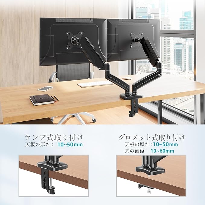 MOUNTUP モニターアーム デュアル 液晶ディスプレイアーム 2画面 13~32インチ対応 ガス圧式 耐荷重2~8kg クランプ グロメット式 VESA対応 75x75mm 100 100mm ケーブル収納