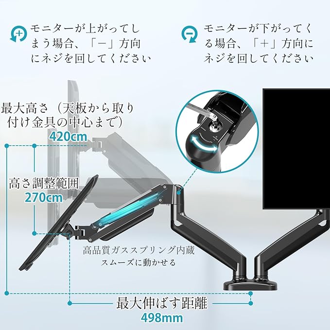 【多角度調整】チルト(上下傾き):上90 /下90 。パン(左右首振り):左90 /右90 。ピボット機能:回転360 。高品質ガススプリング内蔵、より柔軟にモニターの角度を変更できます。回転機能も搭載されたし、画面の横縦の切り替えが手軽に行ないます。
