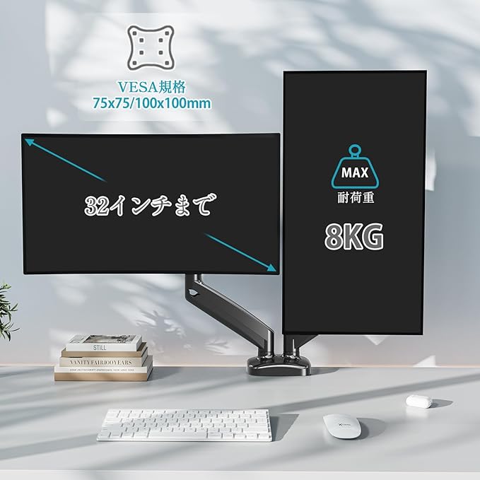 【2画面モニターアーム】軽い力で上下左右や前後に動かせ、液晶ディスプレイの位置を頻繁に変えたい人に向いています。耐荷重は2~8kgで、32インチまでのモニターに対応。準拠のVESA規格は75mm/100mm。(製品について何か質問、または初期不良や欠品などの問題がございましたら、以下の手順でご連絡ください。「アカウントサービス」→「注文履歴」→「販売元」→「質問する?」)