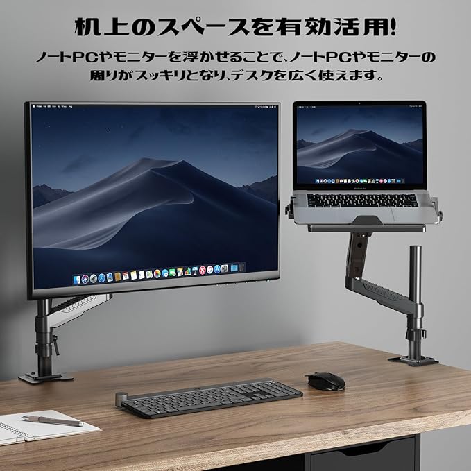 【高品質の素材・省スペース】アルミ合金素材を採用しており、耐久性に優れ、より頑丈でノートPCやモニターをしっかりサポートできます。ノートパソコンは机に置かずに、デスクの空間はより広くなり、デスク上のスペースを有効活用で作業効率が上がります。自宅、オフィス、公共施設などでの使用に大活躍です。注:日本語取扱説明書が付属しておりますので、取り付けの前に、日本語取扱説明書をよくお読みください。