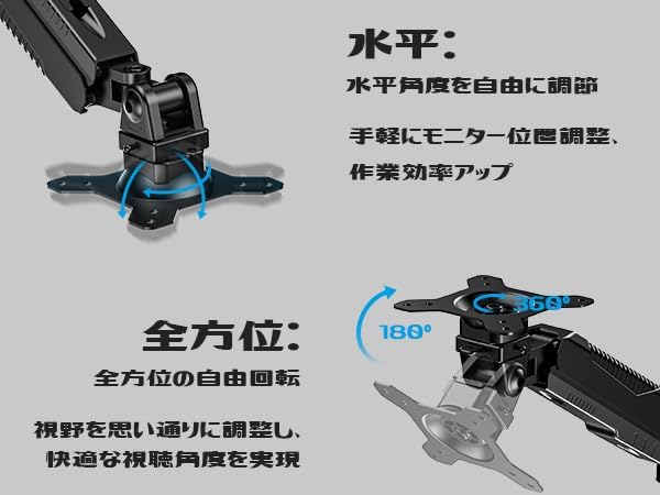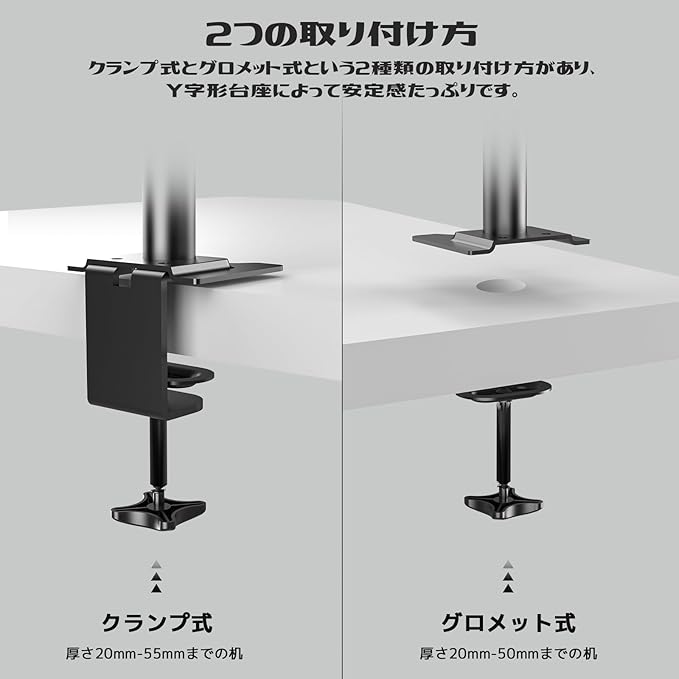 【取り付け簡単】取付方法には2つあります。机に穴のある場合はグロメット式に取り付けられます。机に穴のない場合は机の端に取り付けても可能です。クランプ式で55mmまでのデスクに対応でき、グロメット式で厚さ50mmまでのデスクに対応できます。また、VESA規格は75*75mmと100*100mmの穴があり、11-17インチのノートPC、15-27インチのモニターが取り付けられます。普通のモニターだけでなく、湾曲モニターも取り付けられてます。
