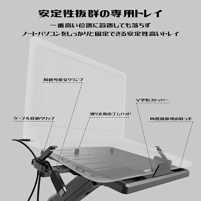 【トレイ付き・ケーブル収納】独創的なトレイを使用します。従来のトレイとは違い、安定性がアップするため、トレイの左右には、固定するためのフックが付くデザインで、ノートパソコンをしっかり掴みます。それに、下にはセンターストッパもあり、パソコンの落下防止もできます。トレイ、アームと支柱にもケーブルクリップが付いているので、ケーブル・配線をまとめてすっきり整理整頓できます。