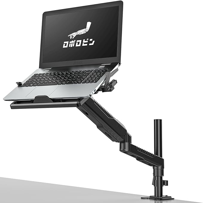ロボロビン ノートパソコンアーム 安定性UPトレイ付き 11-17インチ対応 高さ12~60cm 多角度調整 ガススプリング式 広く可動域 グロメット式&クランプ式 モニターアーム 360度回転 15-27インチモニター対応 ノートPCスタンド アーム ディスプレイアーム ケーブル収納 耐荷重1~7KG VESA75*75/100*100