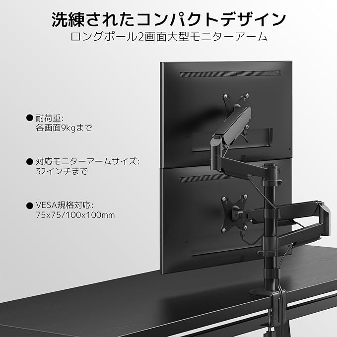 デュアルモニター対応:上下2画面の配置をサポートし、17インチから32インチのモニターに対応します。曲面モニターの使用も可能で、VESA 75x75mmと100x100mm規格に互換性があります