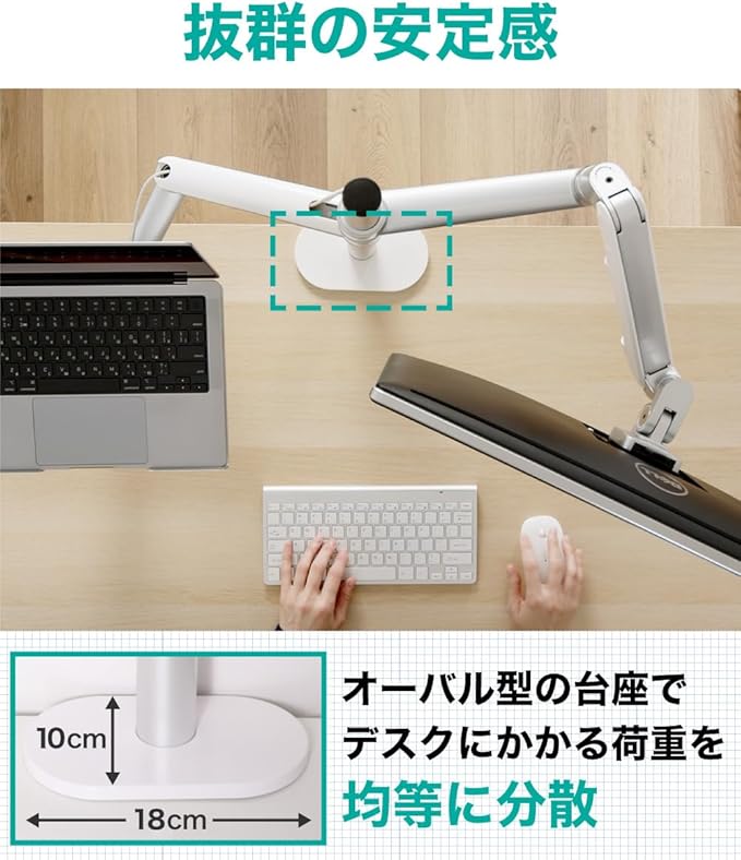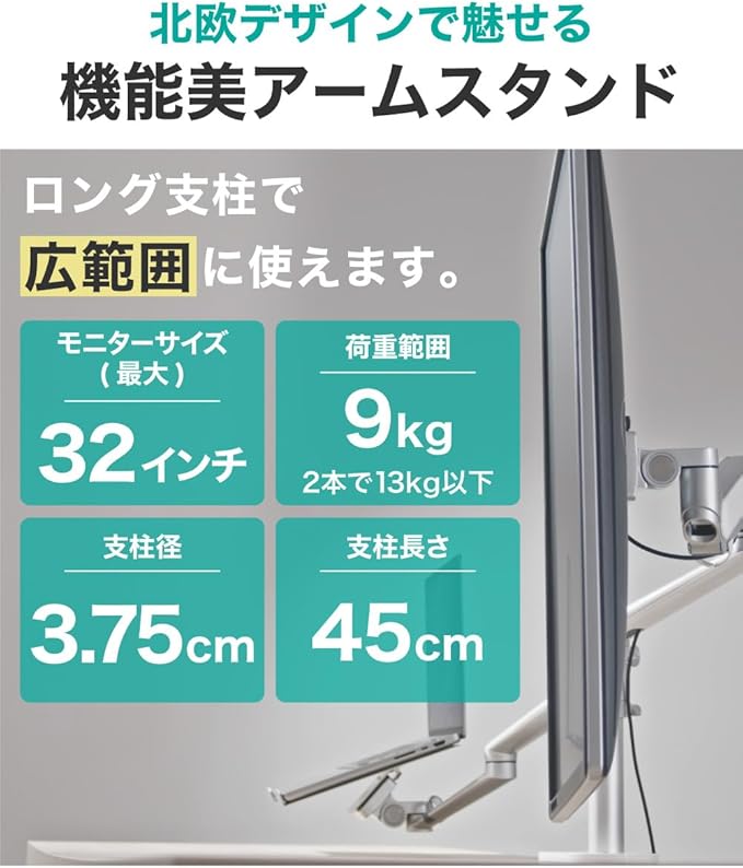 ロングポール: 同シリーズの中では最も長い45cmの支柱でアーム可動域がさらに広範囲に調整が可能になりました。支柱の後ろにある蝶ネジを回してディスプレイ高さを調整します。アームが独立しているため、それぞれのアーム高さを調整することができます。24インチクラスのモニターなら縦置きにも横置きにも並べて設置ができます。※商品画像2枚目、3枚目は23.8インチモニターおよび13.3インチノートパソコンの設置例です。