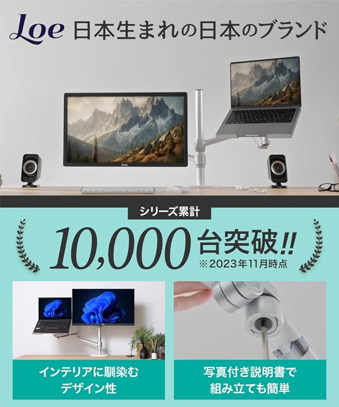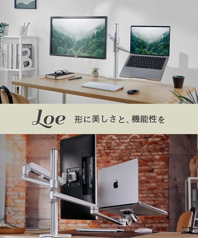 LOE(ロエ) デュアル モニターアーム ノートパソコン Laptop 2画面 縦 上下 配置 液タブ ロング 組み立て簡単 LOLL3L 白 x シルバー