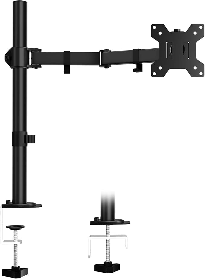製品仕様:対応モニターサイズ:13~27インチ X 1台 、本体の高さ:42.5CM アーム長さ:43CM、耐荷重:8KG VESAサイズ:7.5CM*7.5CMと10CM*10CM