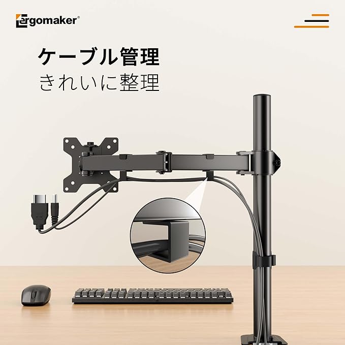 ケーブル管理:モニターアームには、ケーブル管理システムが備わっており、ディスプレイのケーブルをアームの構造にきちんと収納することができます。これにより、作業スペースが整然と保たれます。