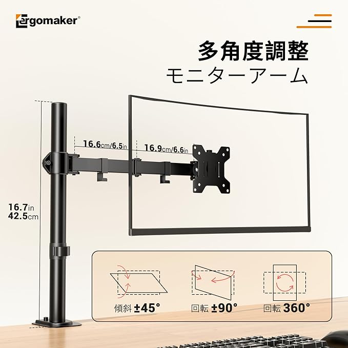 ERGOMAKER モニターアーム ディスプレイアーム 13~27インチモニター パソコンアーム 多角度調節 ケーブル収納 VESA:75x75mm/100x100mm