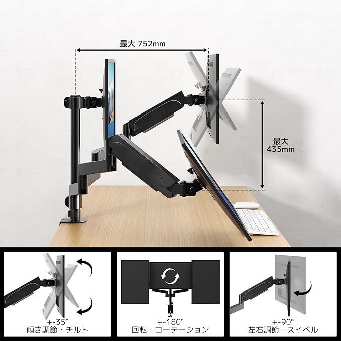 自由自在な調整:革新的な多軸設計により、モニターの高さ、角度、向きを自由に調整可能。上下、左右、前後の動きで、最適な視野を簡単に作れます