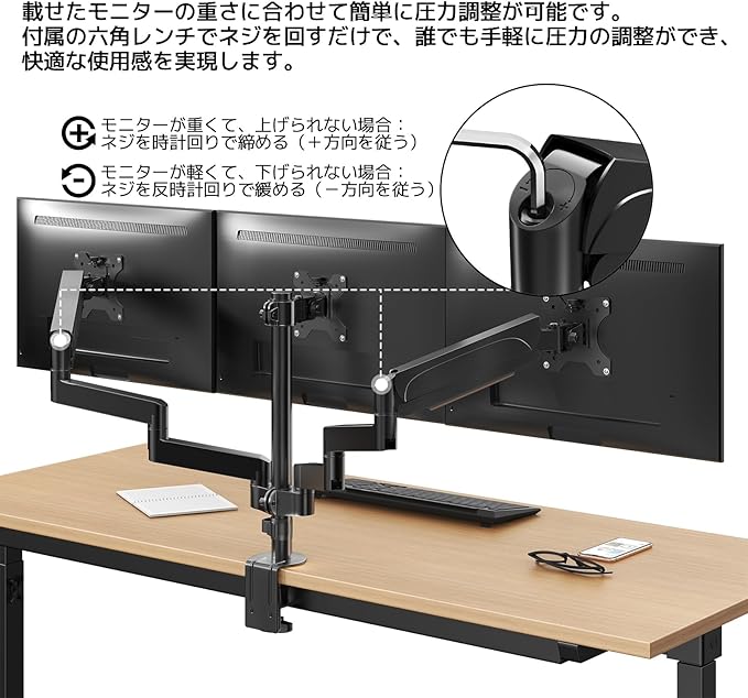 3画面対応で作業効率UP:最大3台のモニターを同時に設置できるため、マルチタスクや複数の作業を一度に行う場合に最適です