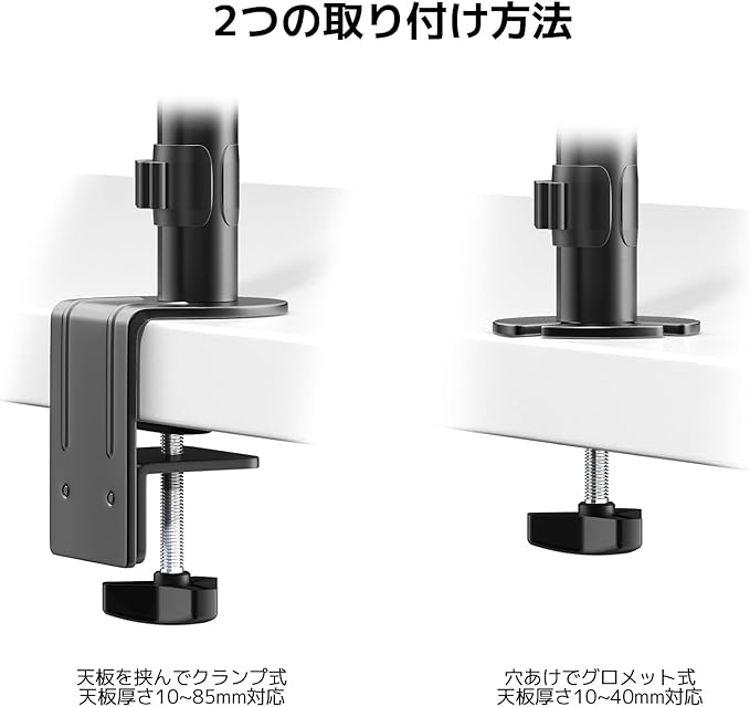 2種類の取り付け方法:クランプ式とグロメット式の2種類の取り付け方法を選べ、デスクの厚さに合わせて簡単に取り付けが可能